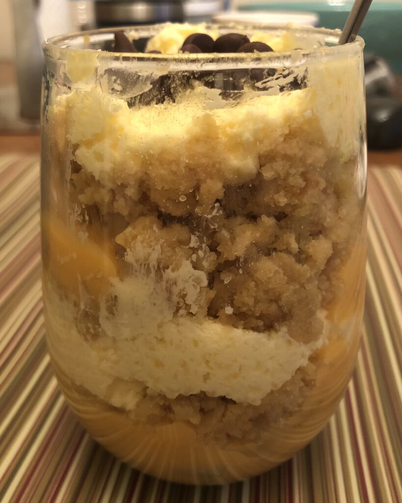 Dorothy planned to make a cantaloupe layer cake with orange curd filling and cantaloupe buttercream last night. The curd ended up being too runny and the layers acted like they were on a Slip ‘N Slide. So she scrapped the cake idea and turned the components into a trifle.