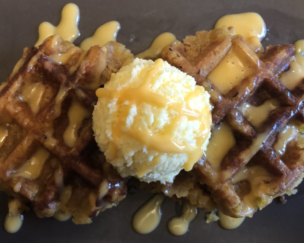 This morning, crumbled cake layers were balled up and placed into the waffle iron. They came out nicely. Out of the waffle iron? Not so nicely. You get out of it what you put into it. Crumbles (noun) going in, crumbles (verb) coming out. They were topped with a scoop of cantaloupe buttercream and an orange curd drizzle.